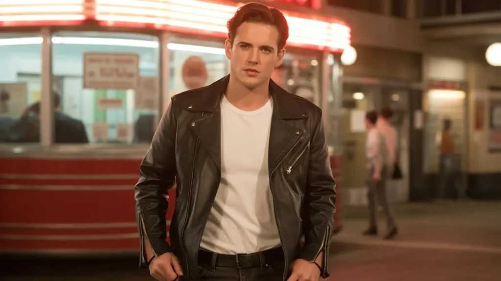Immortalized by icons like James Dean, the leather jacket and jeans combo screamed rebellion and effortless cool. A fitted black leather jacket over a plain white tee paired with dark denim created a rugged, masculine silhouette. Sneakers or boots completed the iconic look.