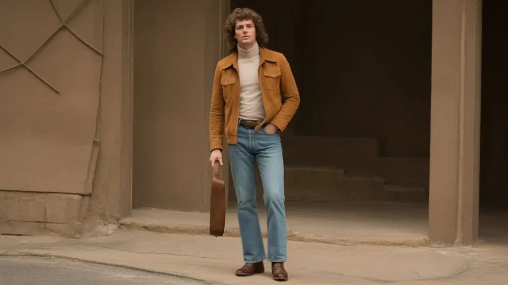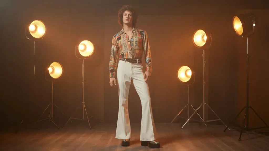 The 1970s brought bold shapes and daring fashion for men, with flared trousers being a standout. Often paired with patterned button-down shirts in vibrant colors or geometric prints, the look captured the disco era’s energy. Add platform shoes for an authentic retro finish.