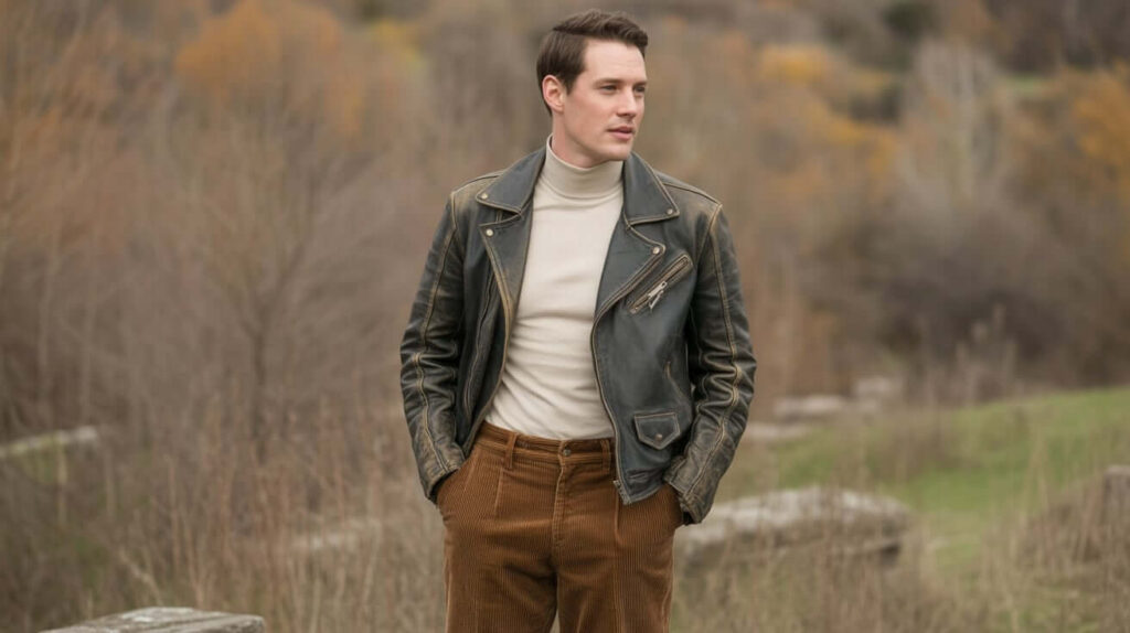 A worn-in leather jacket over a slim turtleneck and corduroy trousers feels nostalgic and tactile. Add lace-up boots and a simple tote to keep it grounded. This mix reads both rugged and considered — ideal for an autumn-to-winter aesthetic that ages well.