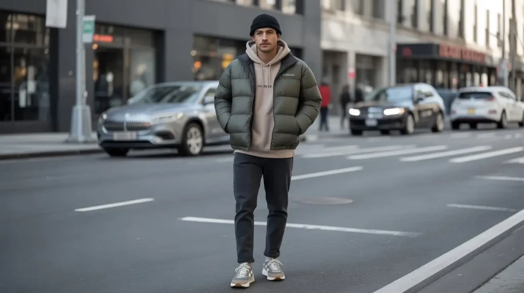 4. Puffer Jacket + Hoodie + Slim Jeans (Urban Street Aesthetic)