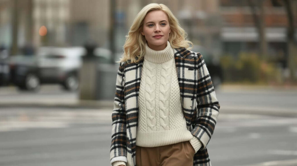 A statement plaid coat layered over a chunky cable knit and tailored pants blends classic pattern with cozy texture. Add loafers or ankle boots and keep accessories minimal to let the coat stand out. This combination reads timeless and polished with a vintage-leaning aesthetic.