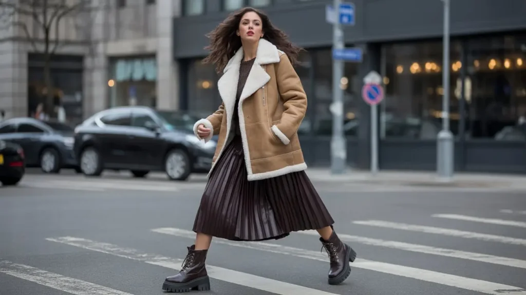 A shearling-collar coat paired with a midi skirt and chunky leather boots blends soft texture with a rebellious edge. Pair with a fitted knit top and a crossbody bag for balance and movement. The contrast between delicate skirt length and hefty boots creates a modern winter aesthetic.