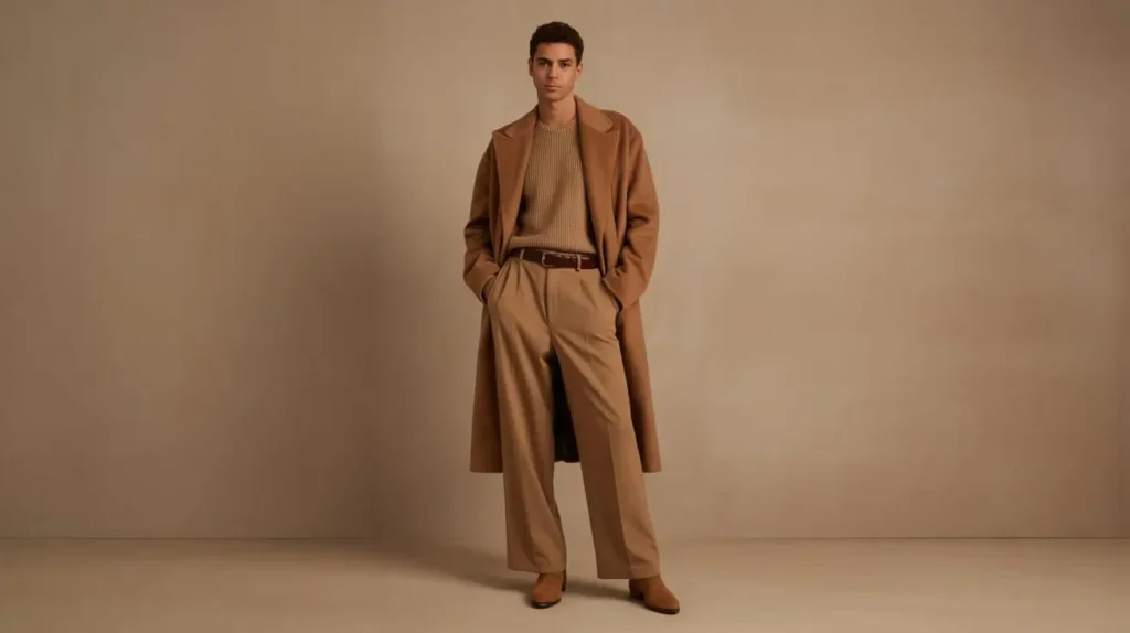 A camel wool overcoat with a matching cashmere sweater and wide-leg trousers creates a warm, minimalist monochrome effect. Add tonal accessories like suede boots and a leather belt to keep the palette rich and cohesive. This tonal approach amplifies the aesthetic while staying comfortable and elegant.