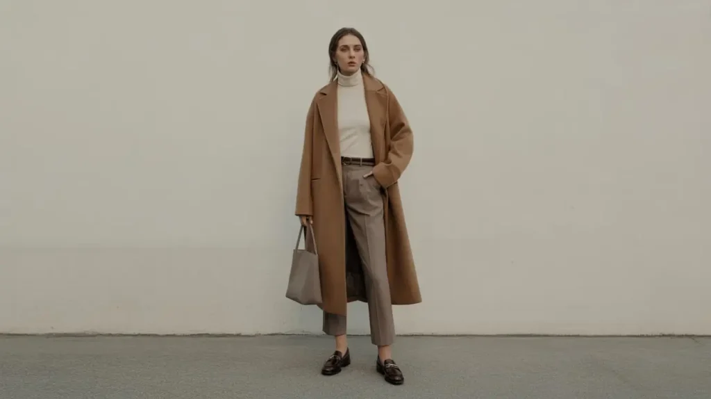 An oversized wool coat draped over a fitted turtleneck and cropped tailored trousers blends cozy volume with smart structure. Add leather loafers or ankle boots and a slim leather tote or satchel to keep the look polished. Small details — rolled sleeves, a simple watch — finish the aesthetic subtly.