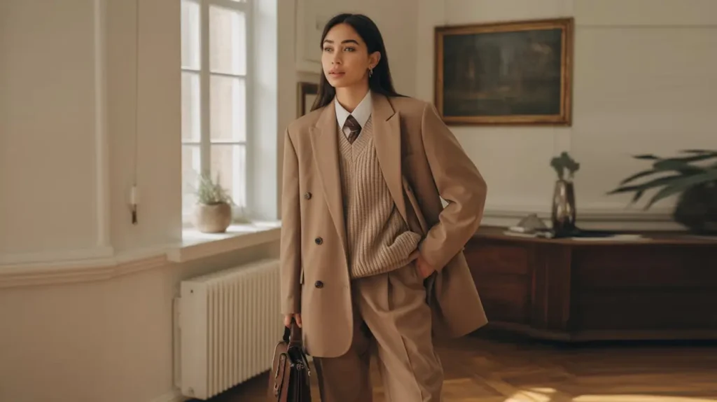 A soft blazer layered over a chunky knit vest and tailored trousers creates a modern, academic-chic aesthetic. Add loafers or low heels and a satchel to complete the look for city or office wear. Play with proportions: slightly oversized blazer, cropped vest, and long trousers.