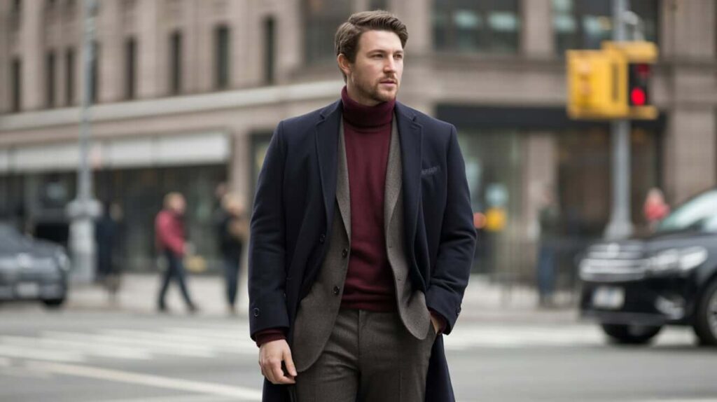 A sharply tailored overcoat with a slim rollneck and wool trousers is a refined, metropolitan aesthetic. Finish with chelsea boots and a leather brief or satchel for city polish. Keep tones deep (charcoal, oxblood, forest) for a moody, sophisticated palette.
