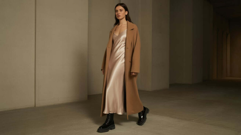 A long cashmere coat layered over a satin slip dress and chunky lug boots juxtaposes elegance with edge. Add opaque tights and a structured bag to keep it grounded for colder weather. The contrast between soft cashmere and rugged boots defines a high-low winter aesthetic.