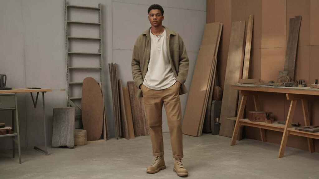 A heavy Henley layered under a wool overshirt and paired with tapered work trousers gives a utilitarian, carefully styled look. Finish with sturdy lace-up boots and a leather belt for cohesion. The ensemble reads functional but purposeful, ideal for colder creative workdays.