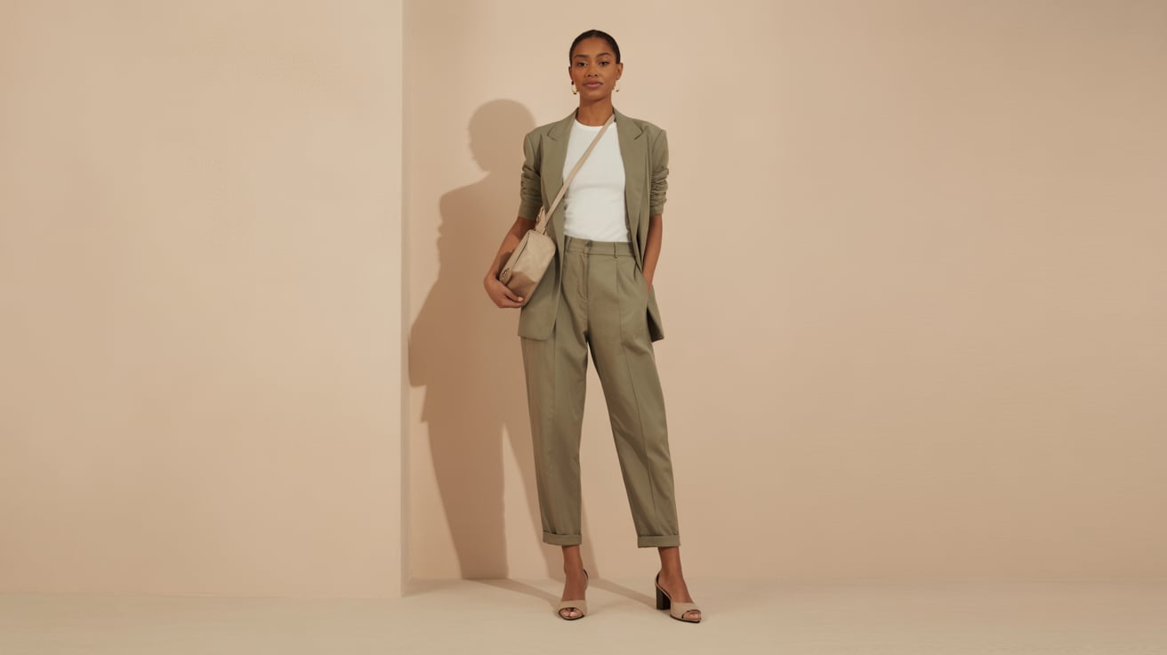 Tapered utility trousers paired with a fitted tee and lightweight blazer create a practical yet styled outfit. Add low block heels or loafers and a crossbody for a functional office day. Stick to structured fabrics to avoid looking too casual.