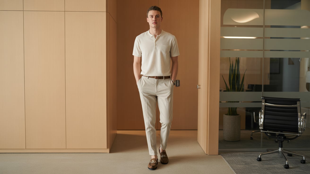 A short-sleeve Henley tucked into slim trousers gives textured casual refinement. Pair with loafers or leather sneakers and minimal accessories for a clean, work-suitable look. Choose neutral Henley colors to keep the outfit cohesive.