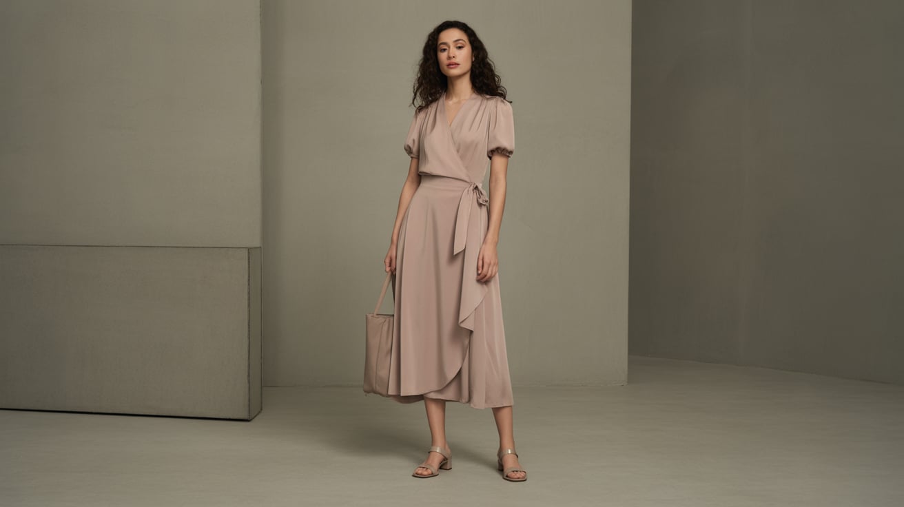 A wrap-style midi dress in breathable fabric offers an easy one-piece outfit that reads professional yet relaxed. Pair with low block heels or polished flats and a slim tote for day-to-day functionality. Keep colors muted or small-scale prints for office appropriateness.