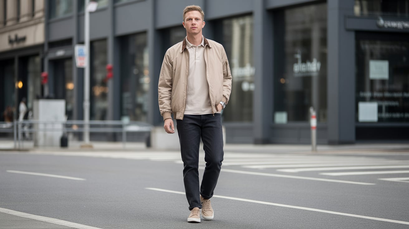 Why it works: The bomber gives a casual layer while the polo and dark jeans preserve a clean, work-ready appearance.
