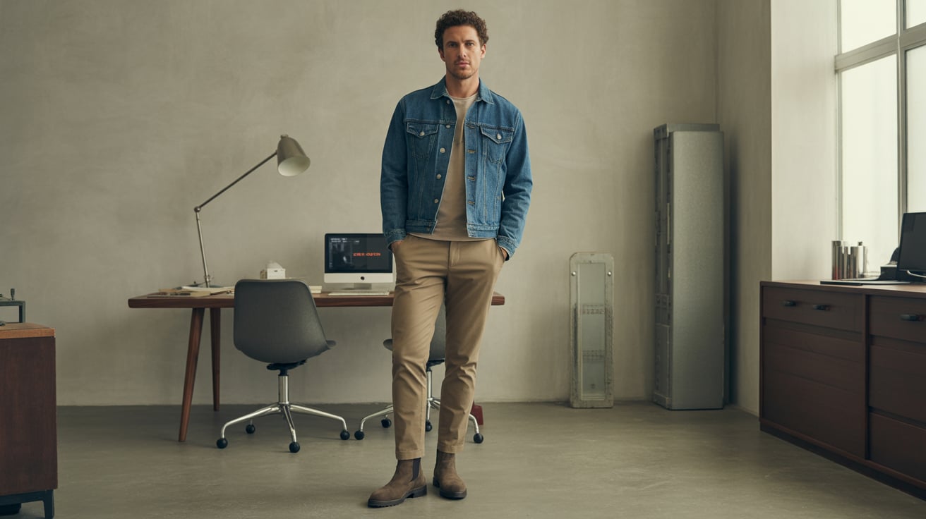 A well-fitted denim jacket layered over a tee and paired with slim chinos gives rugged-casual polish. Add Chelsea boots for a smart edge and a leather satchel for work essentials. Opt for dark washes and neutral chinos to keep it office-appropriate.