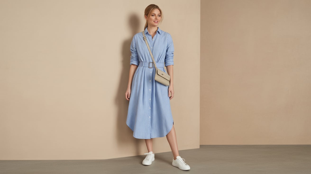 A button-up shirt dress in cotton or poplin is effortless and office-friendly; add low-profile sneakers for comfort. Cinch at the waist with a slim belt if you want more shape and add a crossbody bag for essentials. Roll or cuff sleeves for a relaxed vibe.