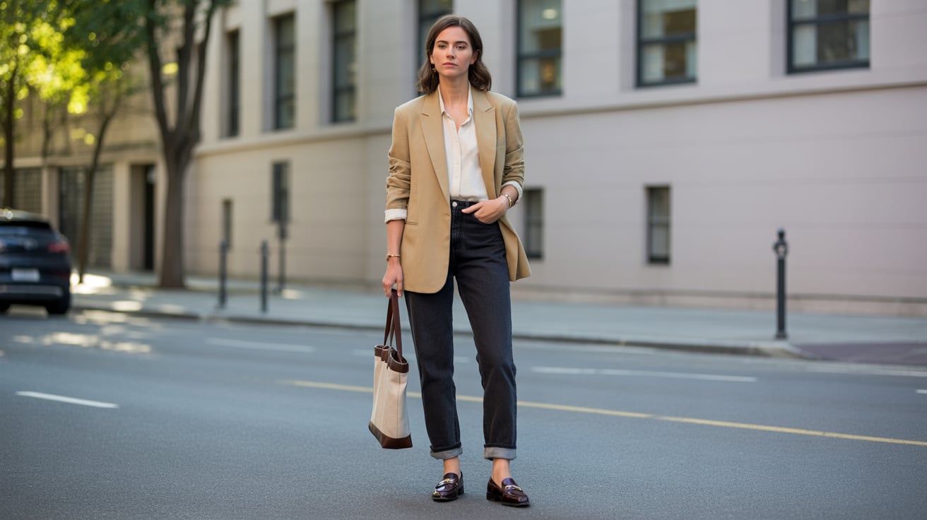 A soft, unstructured blazer layered over a tucked-in blouse and straight-leg dark jeans looks polished but relaxed. Add loafers or low block heels and a compact tote for practicality during the day. Roll the cuffs lightly for an effortless, seasonal touch.