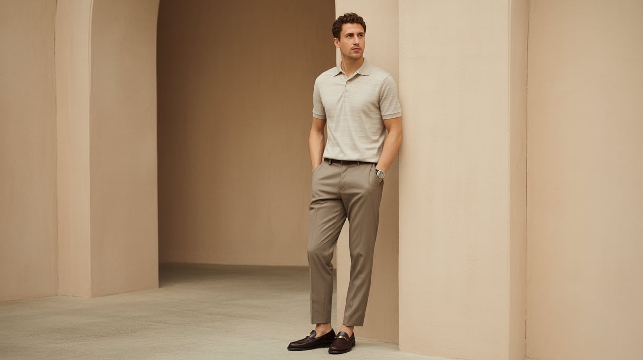 A fine-knit polo tucked into tailored trousers offers a breathable yet refined casual option. Finish with loafers or derby shoes and a minimalist watch for a neat, purposeful appearance. Stick to muted tones for easy coordination.