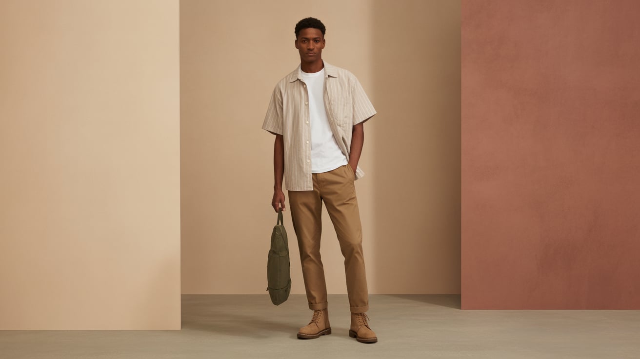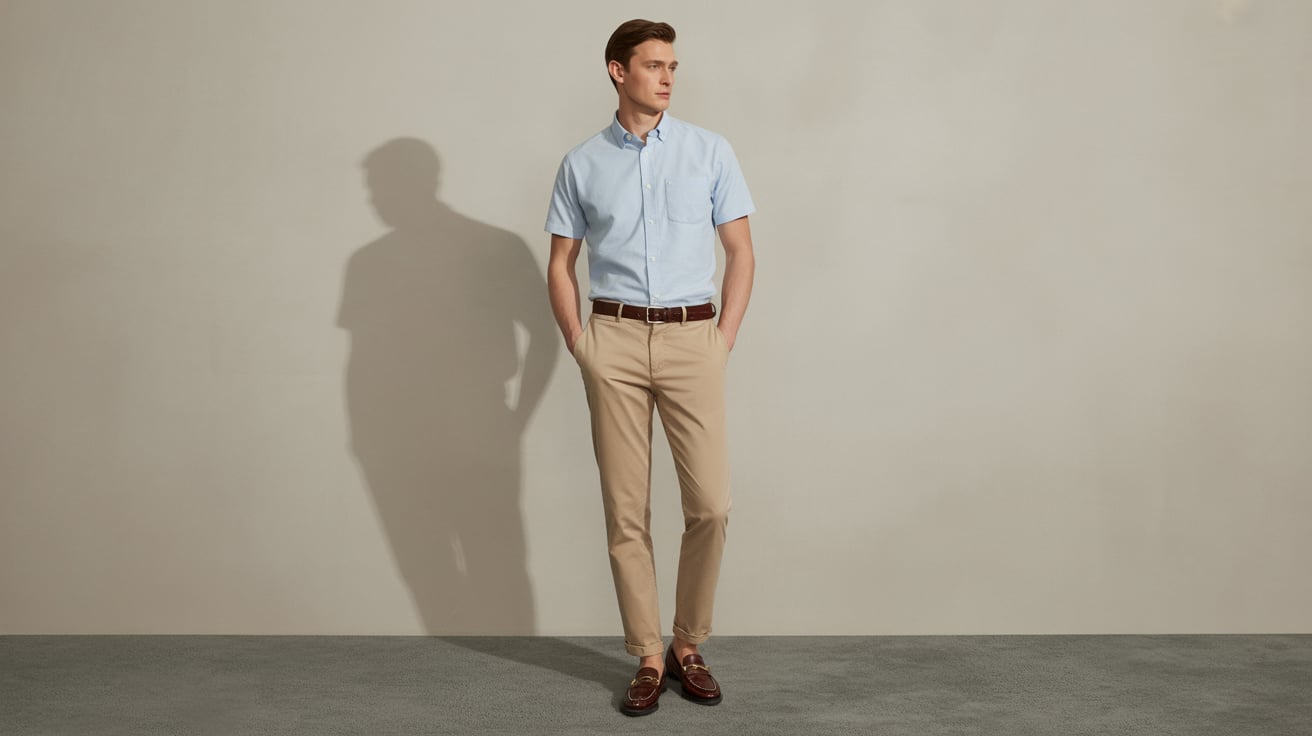 A crisp short-sleeve Oxford shirt tucked into slim chinos balances cool comfort and work-appropriate neatness. Pair with leather loafers or minimalist sneakers and a leather belt to keep it tidy. Choose light colors in summer and deeper tones when it’s cooler.