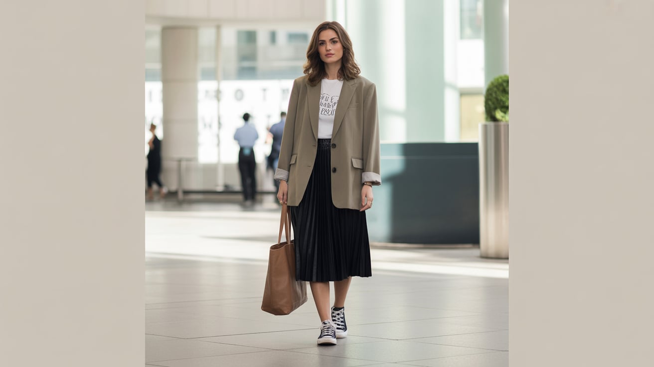 A midi skirt paired with a clean graphic tee and a boxy blazer blends personality with polish. Tuck the tee and add sleek sneakers or loafers for a modern casual-office look. Keep prints subtle and blazer neutral to stay workplace-appropriate.