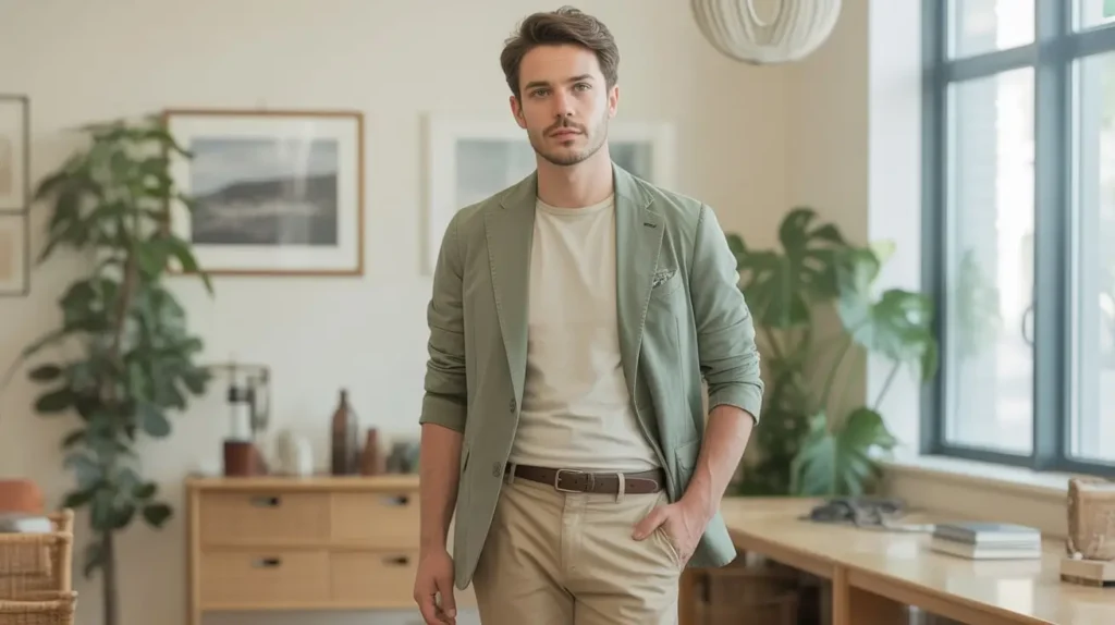 Chinos with a summer-weight unstructured blazer combine ease and polish; pair with a cotton shirt or high-quality tee underneath. Roll the blazer sleeves for a relaxed feel and pick neutral shoes and a simple belt. This outfit transitions well from meetings to casual client lunches.