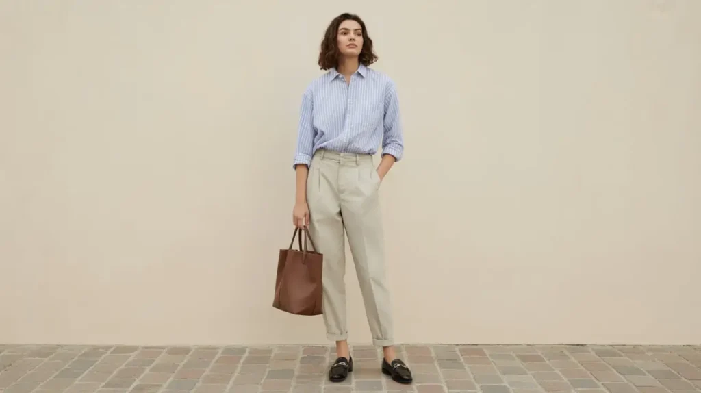 A breathable cotton or poplin shirt paired with tapered trousers gives a neat, breathable silhouette for hot days. Tuck the shirt for a cleaner line, add slip-on loafers or low heels, and carry a compact brief or tote. Neutral tones and subtle checks or stripes work well for offices.
