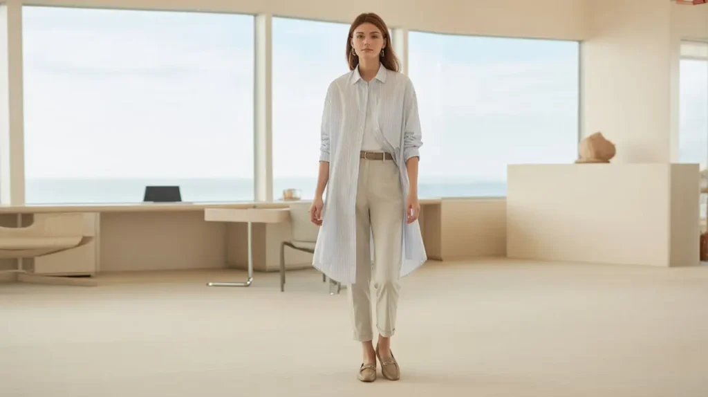 A longline shirt worn as a tunic over slim trousers gives modest coverage with cooling fabric choices like cotton or linen blends. Tuck one side or add a slim belt for shape and finish with flats or loafers. It’s a practical, adaptable look for varied office environments.