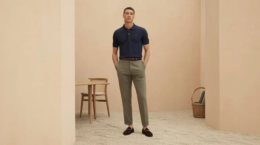 Why it works: The polo delivers breathability while tailored trousers maintain structure and workplace polish.