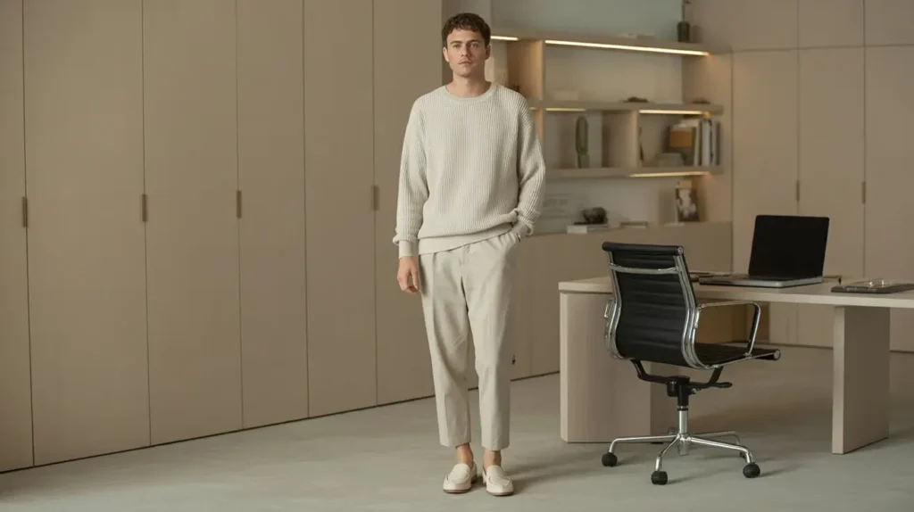A lightweight monochrome set—matching breathable shirt and trousers in a pale tone—creates a clean, elevated line. Break the look with a slim belt or watch and choose minimalist shoes to match; this reduces decision fatigue while looking intentional. Pale camel, stone, or light gray work especially well in heat.
