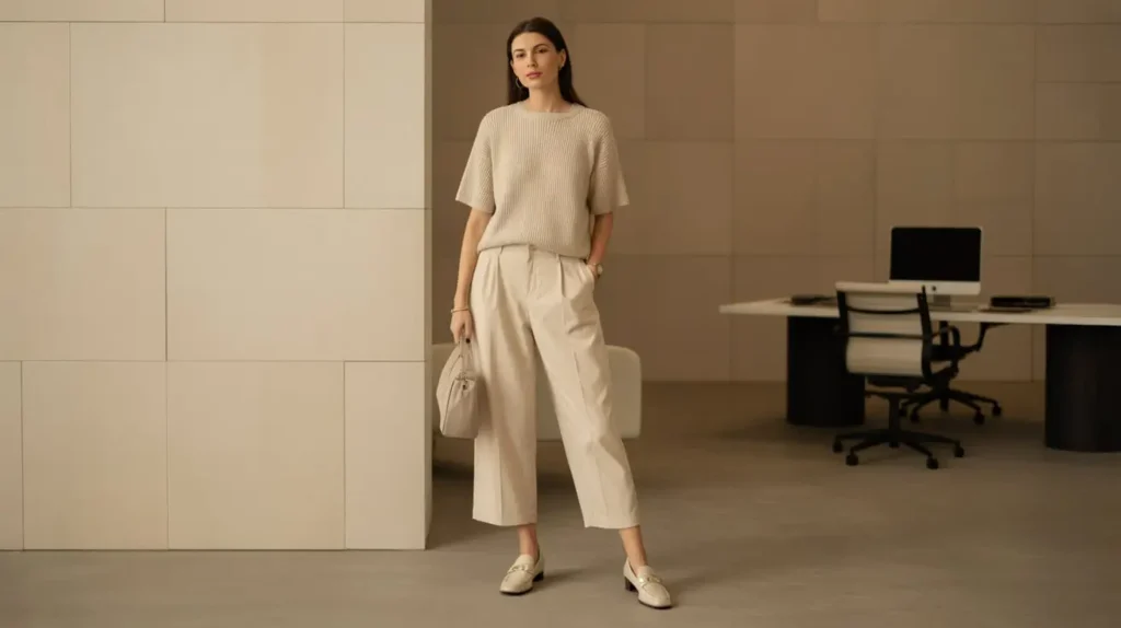 A fine-gauge summer knit (short-sleeve or thin long-sleeve) paired with cropped trousers feels refined and breathable. Tuck the knit slightly at the front to define the waist and add loafers or low block heels. Keep tones soft and tones coordinated for a clean look.
