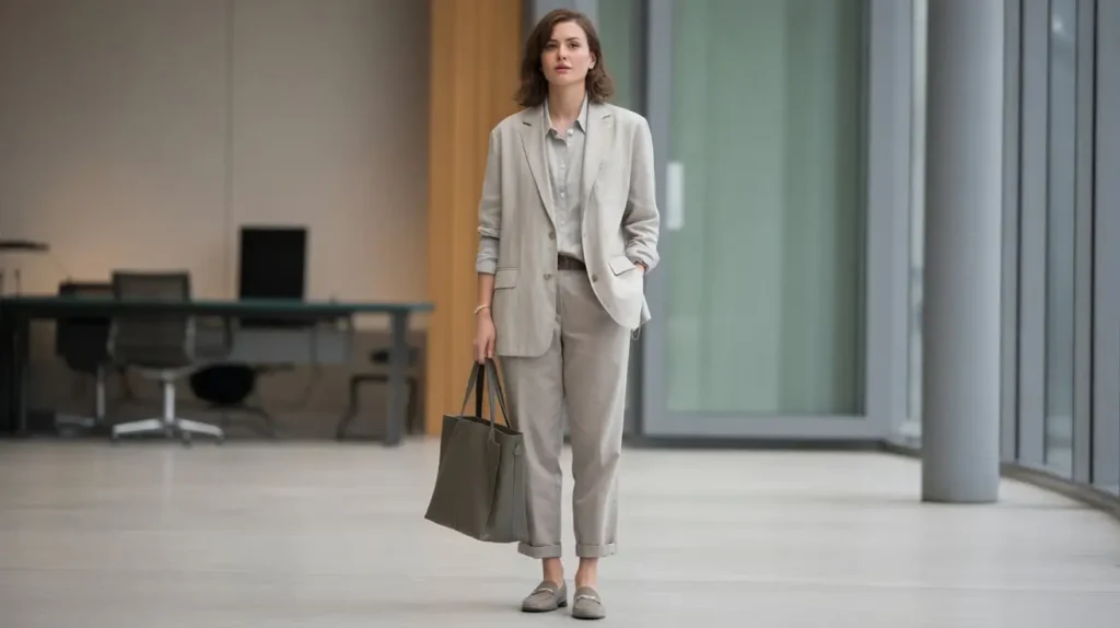 A relaxed linen blazer layered over a cotton or silk shirt with tapered lightweight trousers keeps tailoring while letting air circulate. Roll the sleeves slightly and choose neutral loafers or low heels for a polished finish suitable for most offices. Add a structured tote for commuting and organization.
