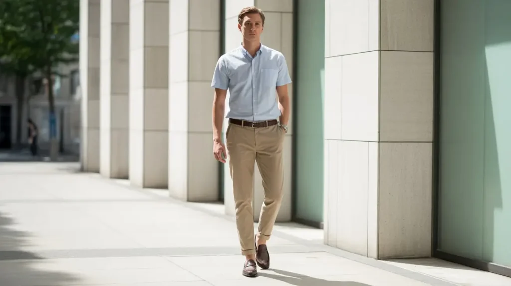 A crisp short-sleeve button-up tucked into slim chinos is smart without the heat of long sleeves; add a slim belt and leather loafers for polish. Choose light or pastel tones to reflect sunlight and keep the look clean and office-appropriate. This is a versatile go-to for warm workdays.
