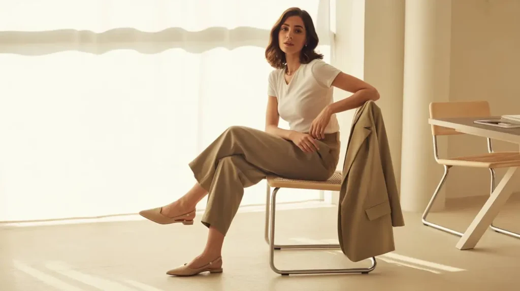 A refined lightweight shell or high-quality tee tucked into ankle-length trousers is summer-simple and neat. Choose breathable fabrics like modal or silk-blends and pair with slingback flats or loafers. Add a light blazer for AC-heavy offices and remove for warmer moments.