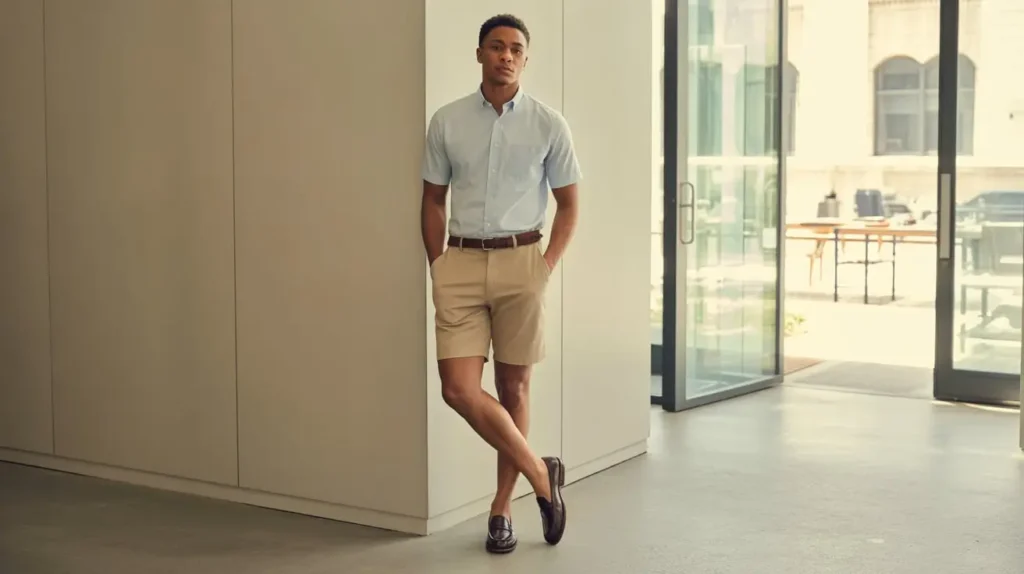 For permissive workplaces, mid-length tailored chino shorts with a crisp short-sleeve or rolled-sleeve shirt balance comfort and smartness. Pair with loafers, brogues, or polished sandals and avoid overly casual sneakers. Keep colors neutral to maintain professionalism.