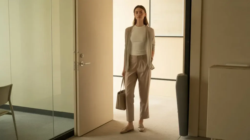 A thin, breathable cardigan layered over a fitted tee and straight dress pants provides flexibility for fluctuating temperatures. Neutral flats or loafers and a compact brief or tote finish the professional ensemble. Layer on a blazer only if meetings demand extra formality.